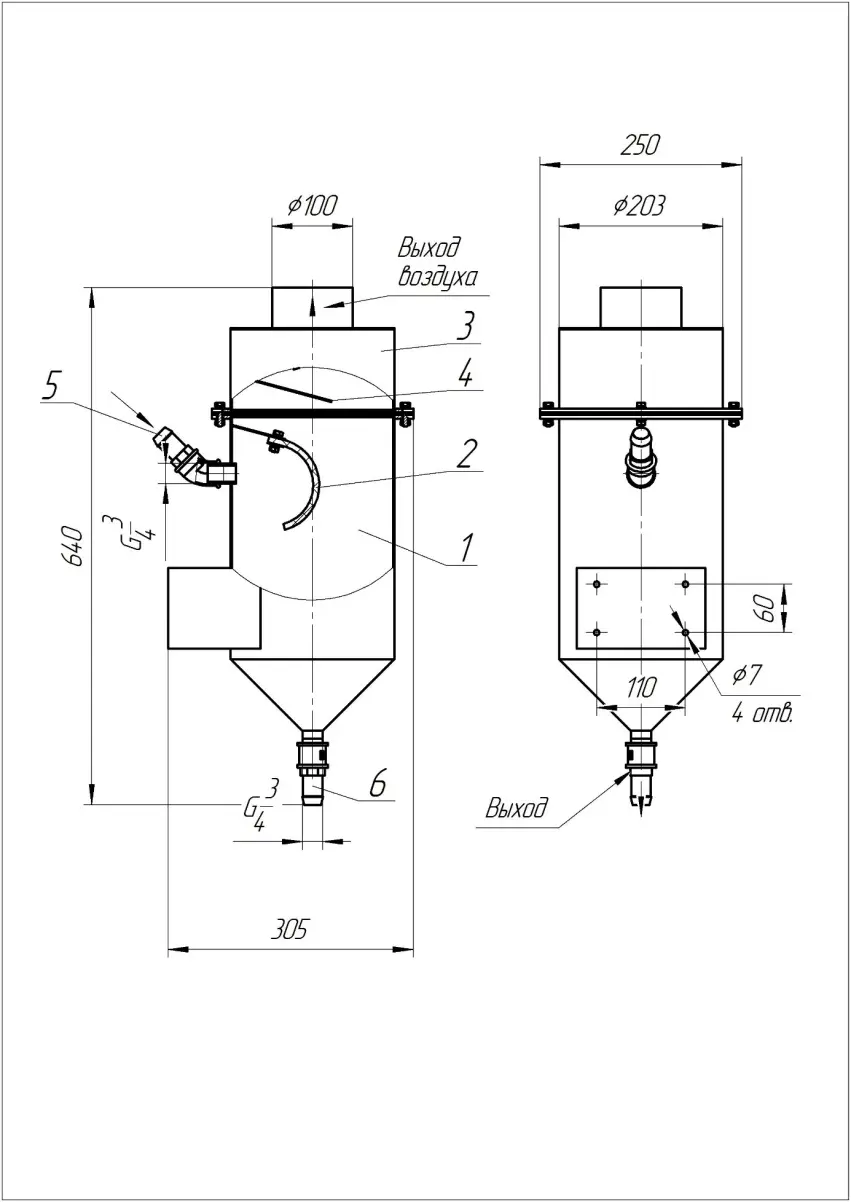Доставляемая на анализ проба и транспортирующий сжатый воздух попадают в блок БПД-2 через штуцер 5 и ударяются о демпфирующую перегородку 2. После чего пульпа сливается в нижнюю часть корпуса и далее выливается через штуцер 6 а транспортирующий воздух через лабиринтные перегородки 4 выходит в систему вентиляции.