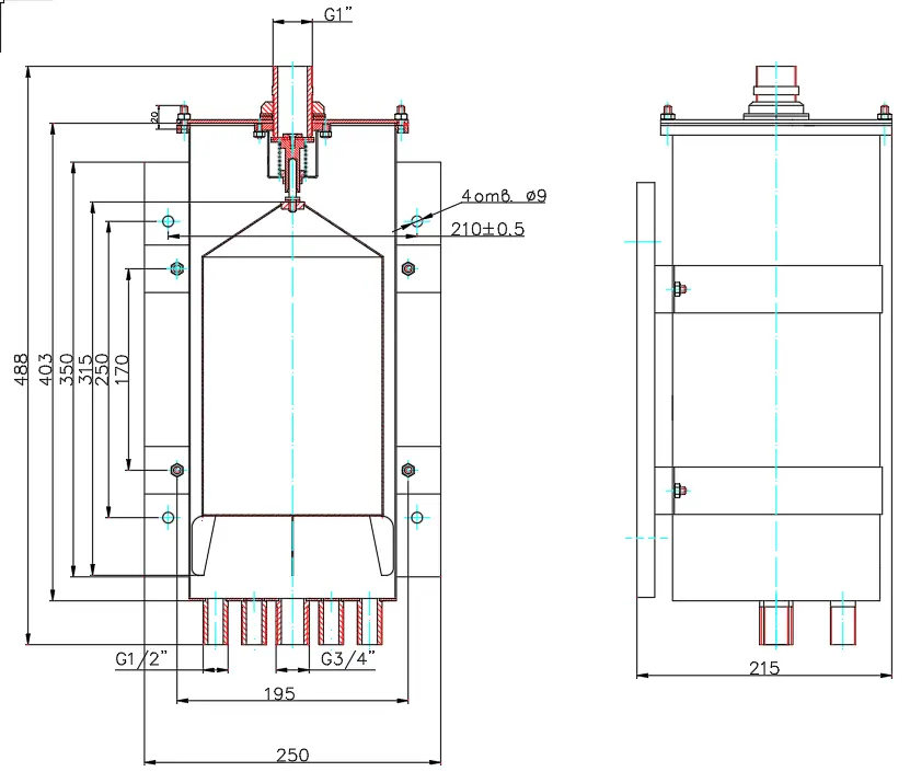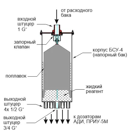 Конструкция БСУ-4 представляет собой стальной цилиндрический корпус с запорным клапаном для входного потока и комплектным поплавковым устройством. Поплавковое устройство с помощью запорного клапана автоматически поддерживает в сосуде постоянный уровень жидкости, что позволяет стабилизировать давление реагента на входе в дозатор и соответственно, расход реагента. Блок БСУ-4, в отличие от БСУ-1 имеет 4 рабочих выходных штуцера.