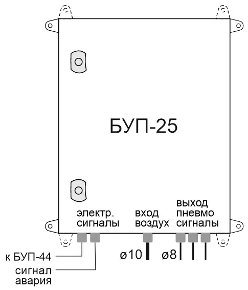 Управляющие электрические сигналы поступают из блока управления БУП-44. Выходными управляющими сигналами блока БУП-25 являются пневматические сигналы, которые поступают на пневмомеханизмы по гибким полиэтиленовым трубкам, входящим в комплект поставки.