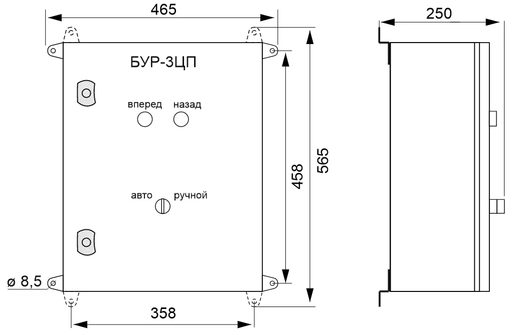 Блок управления реверсивный циклический БУР-3ЦП оснащен реле времени, обеспечивающим формирование управляющих пневматических сигналов двигателем механизма в соответствии с заданными интервалами времени. Блок БУР-3ЦП может работать также в ручном режиме управления механизмом кнопками, расположенными на лицевой панели устройства.