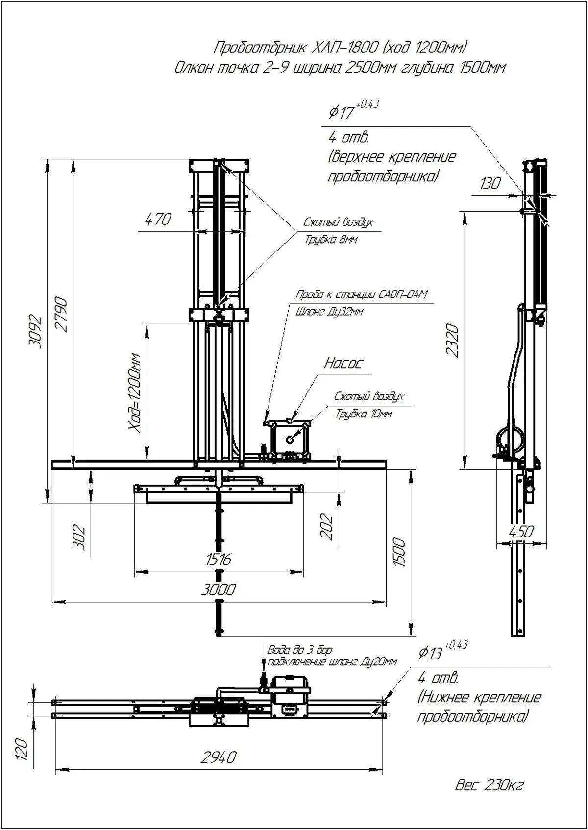 Хвостовой автоматический пробоотборник «ХАП-1800» предназначен для автоматического отбора технологических проб из желобов и баков с уровнем пульпы до 2-х метров глубины